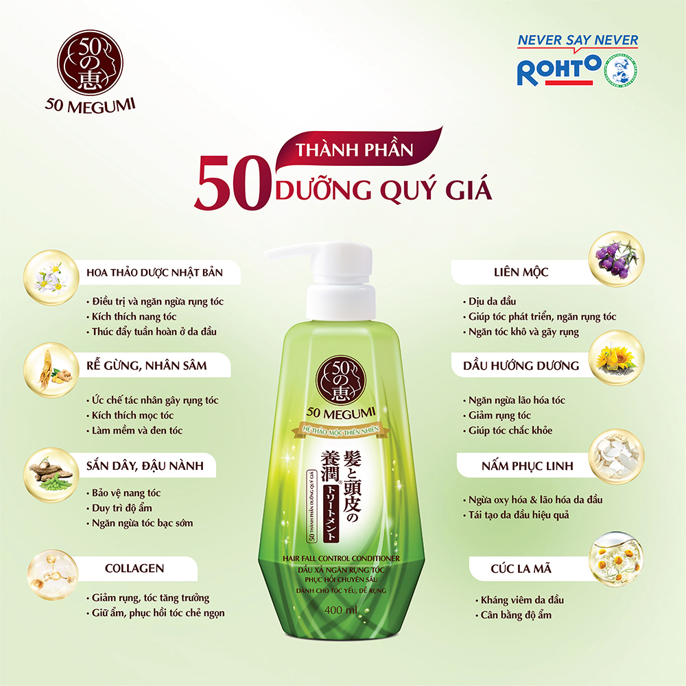 Trong tiếng Nhật, “Megumi” mang ý nghĩa là “điều tốt lành”. Với 50 MEGUMI, chúng tôi mong muốn mang đến thật “nhiều điều tốt lành” cho mái tóc và da đầu của bạn với 50 thành phần dưỡng quý giá được chọn lọc kĩ lưỡng phù hợp với tình trạng tóc và da đầu trước ngưỡng tuổi 40, cung cấp nguồn dinh dưỡng tối ưu cho da đầu, giữ mái tóc dày và khỏe mạnh. Hãy tận hưởng “nhiều điều tốt lành” mỗi ngày với sự trẻ trung và rạng rỡ.