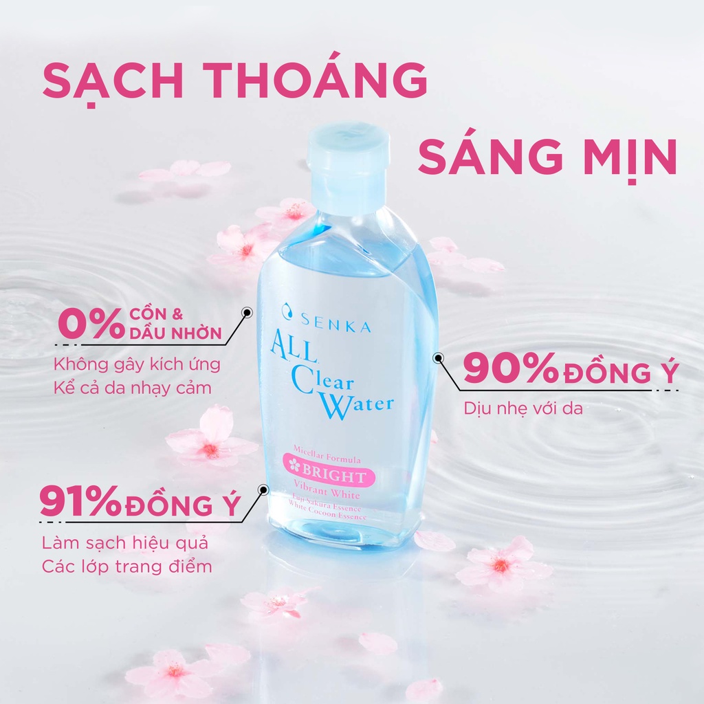 Nước tẩy trang dưỡng trắng Senka All Clear Water Micellar Formula Bright 230ml không cồn dịu nhẹ cho da giúp làm sạch bụi bẩn, bã nhờn, lớp trang điểm lâu trôi sâu bên trong lỗ chân lông, đồng thời làm mờ vết sạm, dưỡng trắng cho làn da ẩm mịn, sáng rạng rỡ