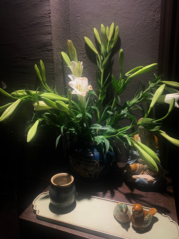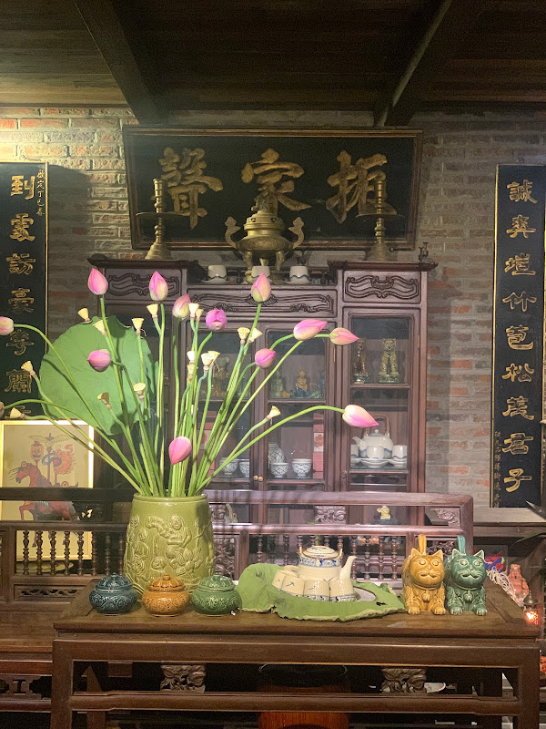 Sắp xếp bàn ghế tủ gỗ mang lại cho mình nhiều cảm xúc, như bước về thủa còn bé; Ngồi tại sảnh chờ, nhâm nhi chén nước vối tự thấy nhớ hồi nhỏ hay được uống chè tươi, nước vối. Cũng rất lâu rồi mình mới xơi cơm bằng đũa cả.